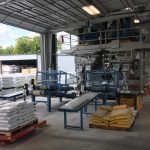 After exiting the bag flattener conveyor, they are discharged at a gravity roller conveyor where operators pick them up for manual palletizing. In an automatic bagging system, the bags are discharged onto a pacing or squaring conveyor where they are positioned and aligned for pick up by a robotic arm or gantry palletizer system.