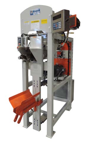 The operator installs an empty valve bag and manually clamps it down to the bag filling spout. The operator then presses the start button and material enters through the top of unit into a surge hopper. The hopper contains a spiral agitator that promotes the flow of the material into the auger. The auger then turns on and off from the command controller to fill the valve bag to a set point weight. The bag clamp is then released and the operator removes the filled valve bag from the bag chair.
